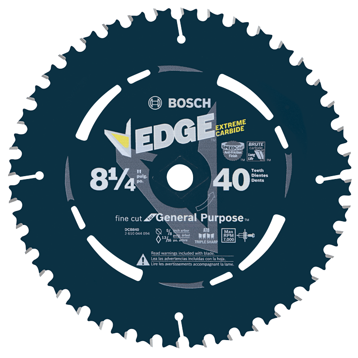 Bosch Edge Circular Saw Blades start sharp, stay sharp and resist impact damage for long life. They are designed for tough construction jobs, because they are engineered with Brute Carbide, an upgraded C3/C4 micrograin carbide formulation that increases impact resistance. They have face-ground teeth for clean cuts and excellent finish. The special tooth geometry and teeth count provides high-quality finishing cuts in wood. To avoid warping, these blades have been built with expansion slots. These blades also feature control cut shoulders to reduce kickback, and they have body slots for excessive heat.