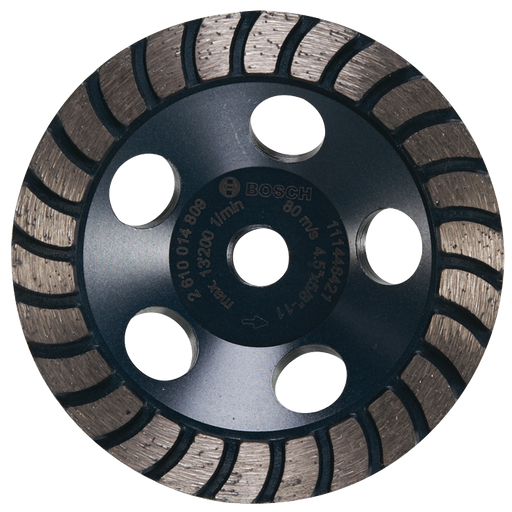 Original price $65.95 - Original price $65.95Original price$65.95 price$65.95 - $65.95Current price $65.95 priceThe Bosch Turbo Diamond Cup Wheel provides controlled material removal and a smooth final grind for concrete. Holes in the steel body were added to aid dust control. The wheel itself is precision balanced for less vibration and a better grind. The wheel is more durable than bonded abrasive wheels for concrete and masonry applications. It features a spin-on thread interfaces for toolless mounting to an angle grinder.