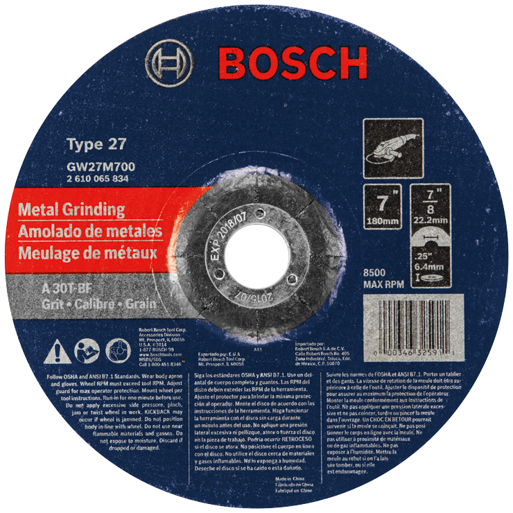 • Bosch 7 In. 1/4 In. 7/8 In. Arbor Type 27 30 Grit Grinding Abrasive Wheel - GW27M700 – Genuine Bosch Commerical replacement part designed for a precise factory fit and reliable performance.