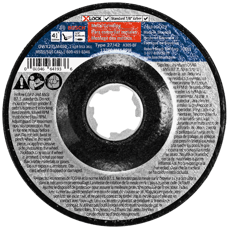 • Bosch 4-1/2 In. x 1/4 In. X-LOCK Arbor Type 27 30 Grit Metal Grinding Abrasive Wheel - GWX27LM450 – Genuine Bosch Commerical replacement part designed for a precise factory fit and reliable performance.