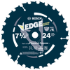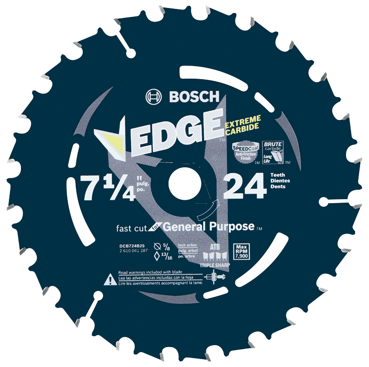 Bosch Edge Circular Saw Blades start sharp, stay sharp and resist impact damage for long life. They are designed for tough construction jobs, because they are engineered with Brute Carbide, an upgraded C3/C4 micrograin carbide formulation that increases impact resistance. They have face-ground teeth for clean cuts. A round 5/8 In. arbor with a diamond knockout makes it compatible with both sidewinder and worm drive saws. To avoid warping, these blades have been built with expansion slots. These blades also feature control cut shoulders to reduce kickback, and they have body slots for excessive heat.