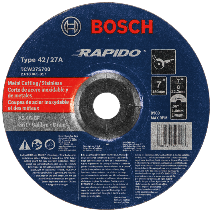 Bosch premium-grade wheels are constructed of high-quality material for metal, concrete, masonry, pipeline, asphalt and stainless steel cutting. Easy-to-read labels are incorporated into the manufacturing process and therefore remain intact throughout the life of the wheel. Bosch uses only superior virgin grains made to exacting specifications. This accessories line is the perfect match for Bosch's trusted grinder lineup and applications include polishing, debris removal and dust extraction.