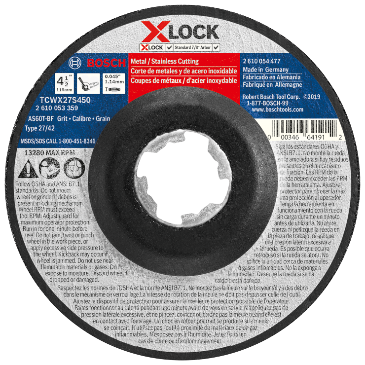 • Bosch 4-1/2 In. x 0.045 In. X-LOCK Arbor Type 27A (ISO 42) 60 Grit Fast Metal/Stainless Cutting Abrasive Wheel - TCWX27S450 – Genuine Bosch Commerical replacement part designed for a precise factory fit and reliable performance.